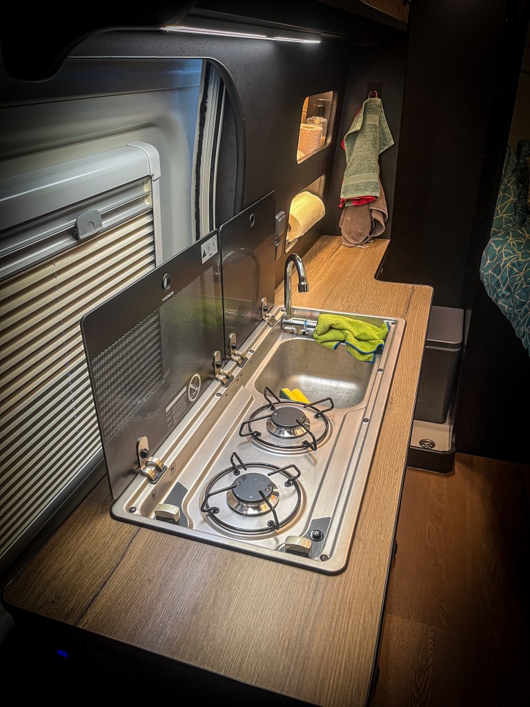 Cocina completa: Ideal para tus aventuras gastronómicas en la carretera, incluye numerosos cajones y armarios, un amplio frigorífico de 86 litros y una cocina de dos fuegos @dometic.