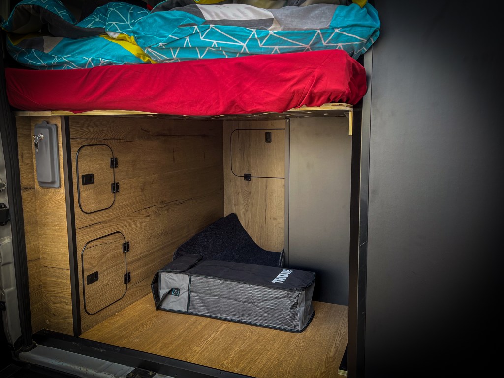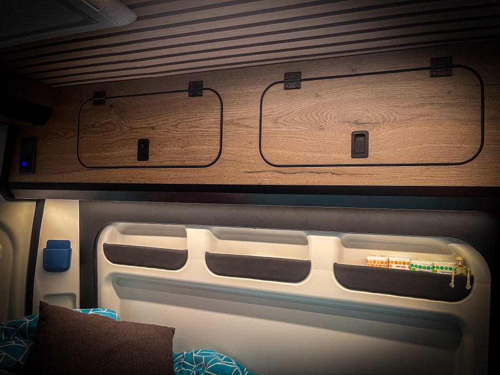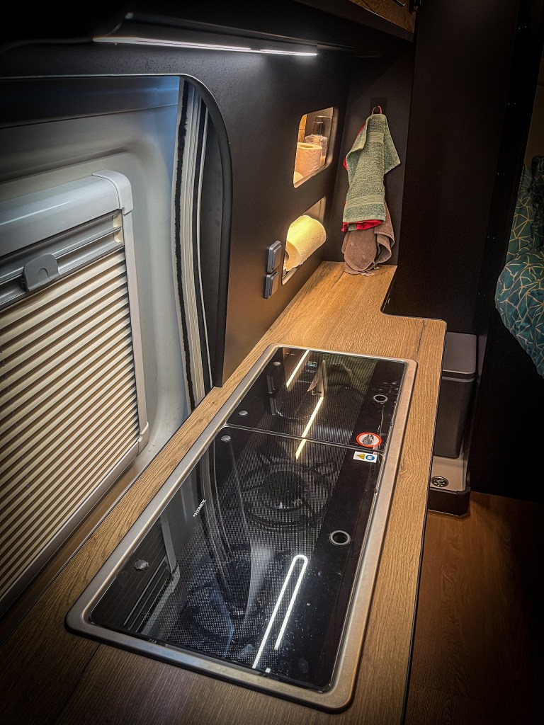 Esta camper ha sido construida para durar y proporcionar estilo en cada detalle. El mobiliario está elaborado en contrachapado de chopo fenólico HPL con combinación de negro mate y Atavia de Tableros Norteños, trabajando con precisión milimétrica en nuestro centro de mecanizado. Para el suelo, se ha elegido el elegante y duradero parquet vinílico Vettonia en Roble Pomerania de @kronpol_esp.