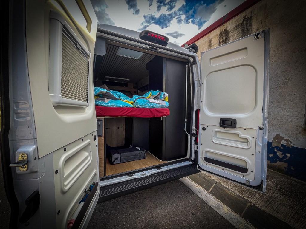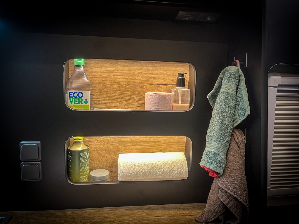 En el maletero, encontrarás múltiples huecos de almacenamiento, acceso sencillo a la instalación de agua y una práctica ducha exterior con agua fría y caliente, pensada para todas tus aventuras.