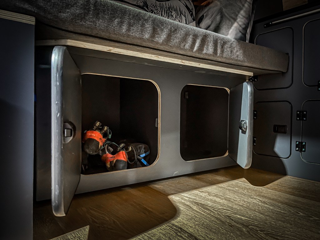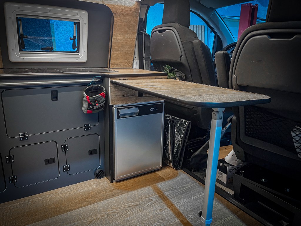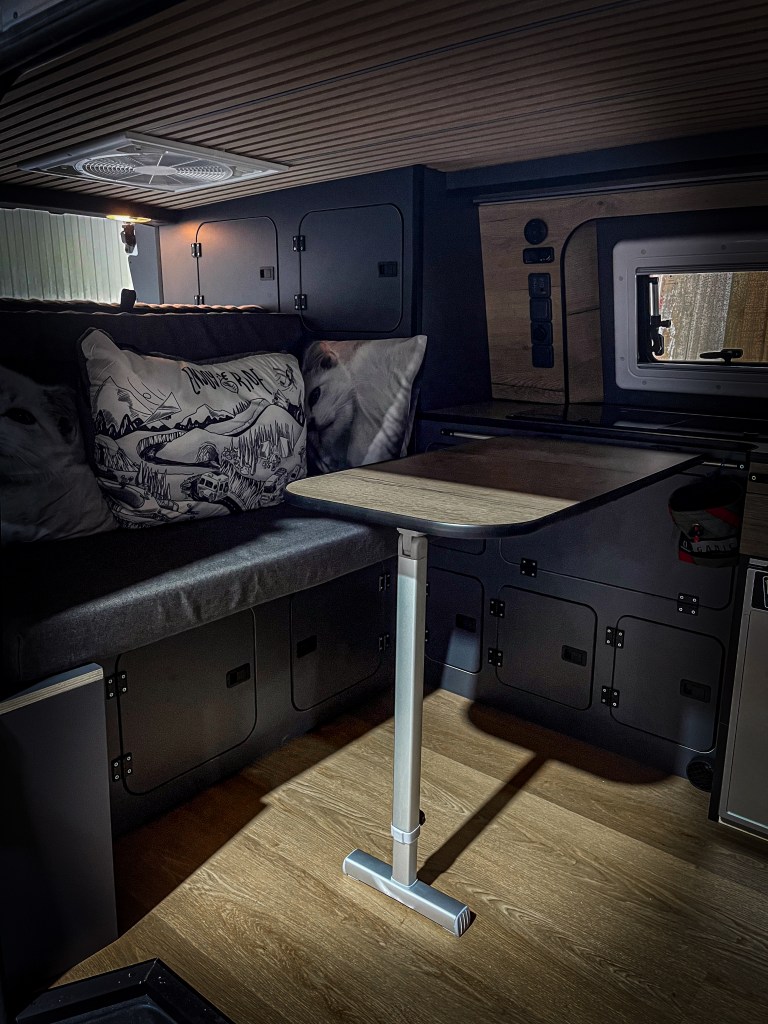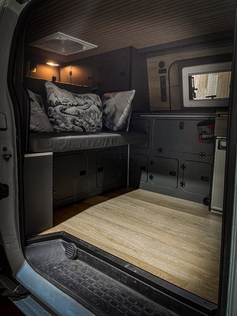 Esta camper ha sido construida para durar y proporcionar estilo en cada detalle. El mobiliario está elaborado en contrachapado de chopo fenólico HPL con combinación de gris antracita y Atavia de Tableros Norteños, trabajando con precisión milimétrica en nuestro centro de mecanizado. Para el suelo, se ha elegido el elegante y duradero parquet vinílico Vettonia en Roble Pomerania de @kronpol_esp.