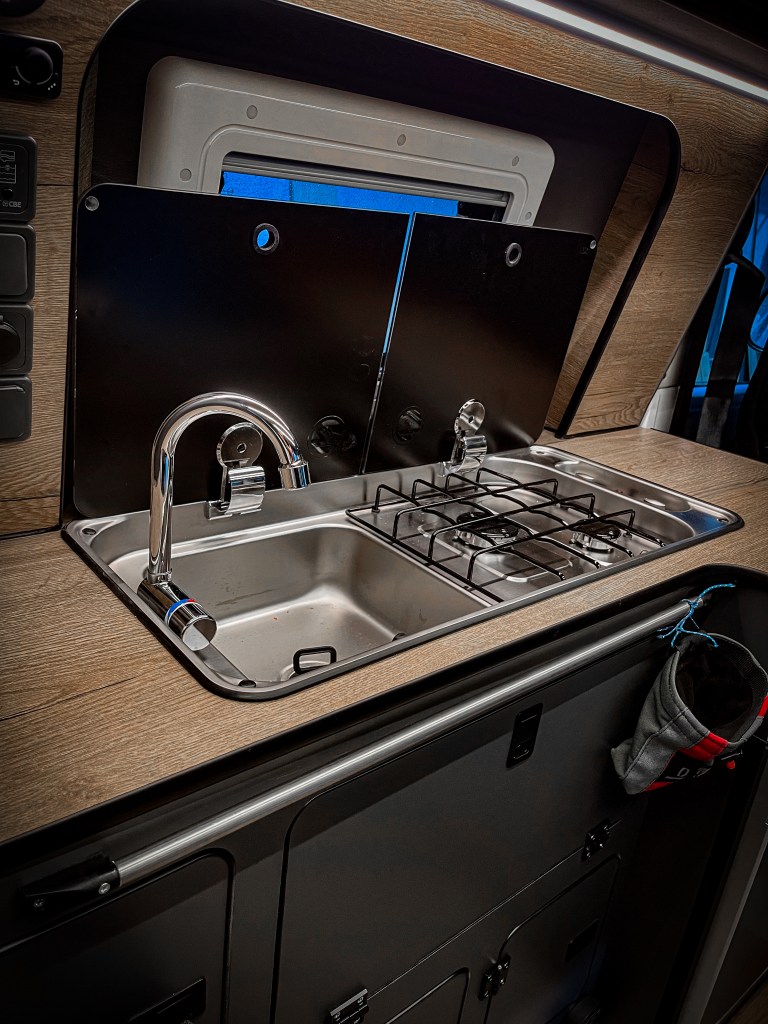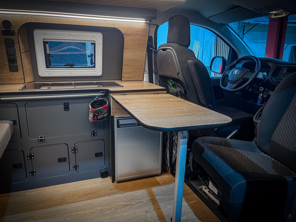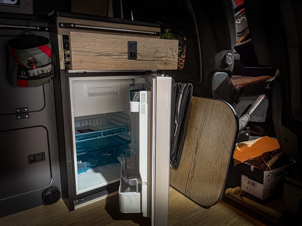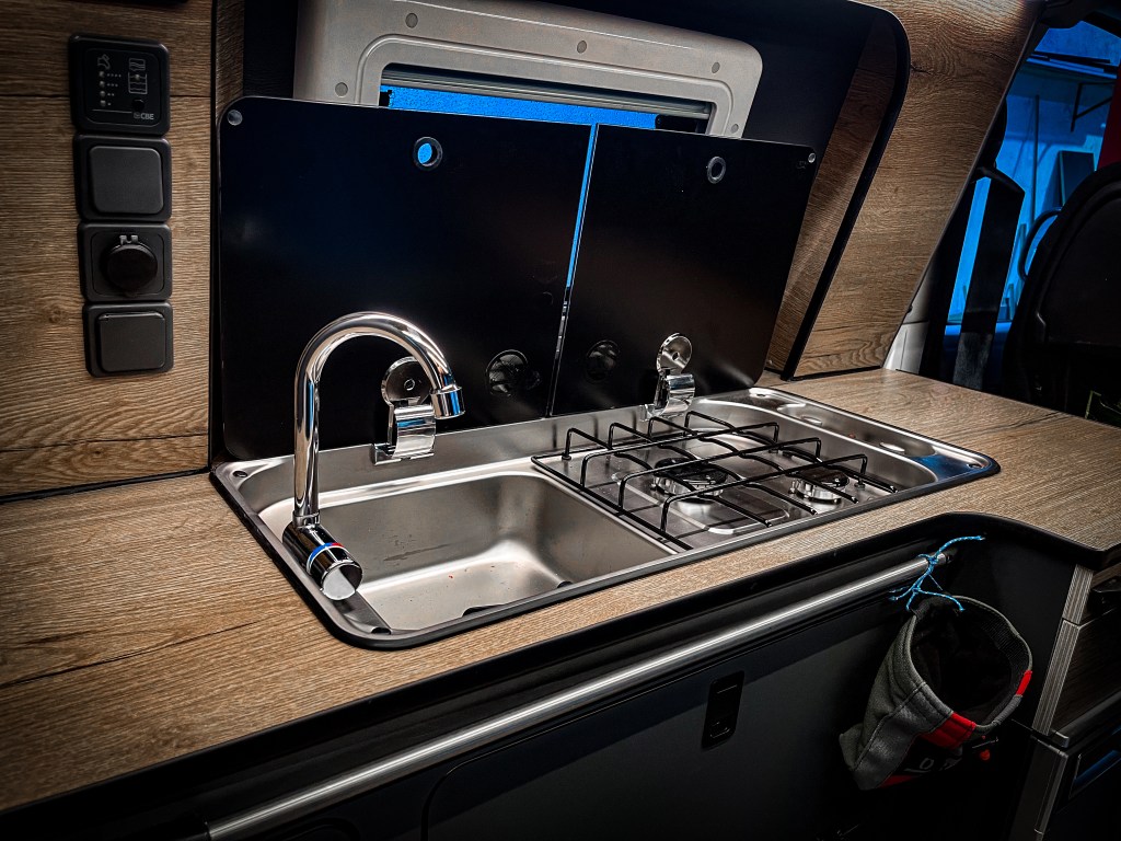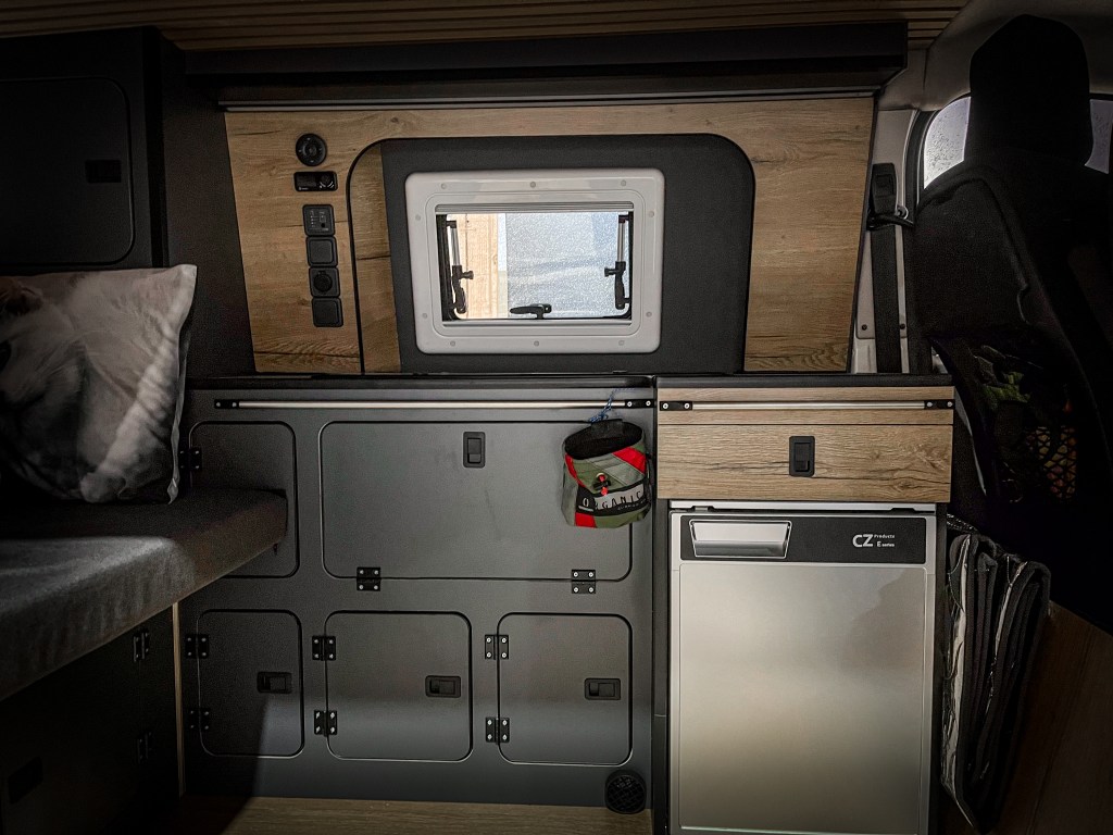 Cocina completa: Ideal para tus aventuras gastronómicas en la carretera, incluye numerosos cajones y armarios, un frigorífico de 50L y una cocina de dos fuegos con fregadera.