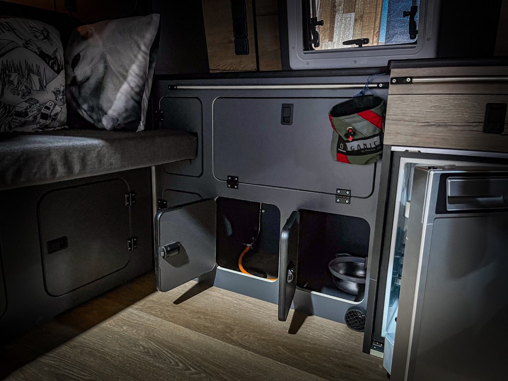 En el maletero, encontrarás múltiples huecos de almacenamiento, acceso sencillo a la instalación de agua y una práctica ducha exterior con agua fría, pensada para todas tus aventuras.