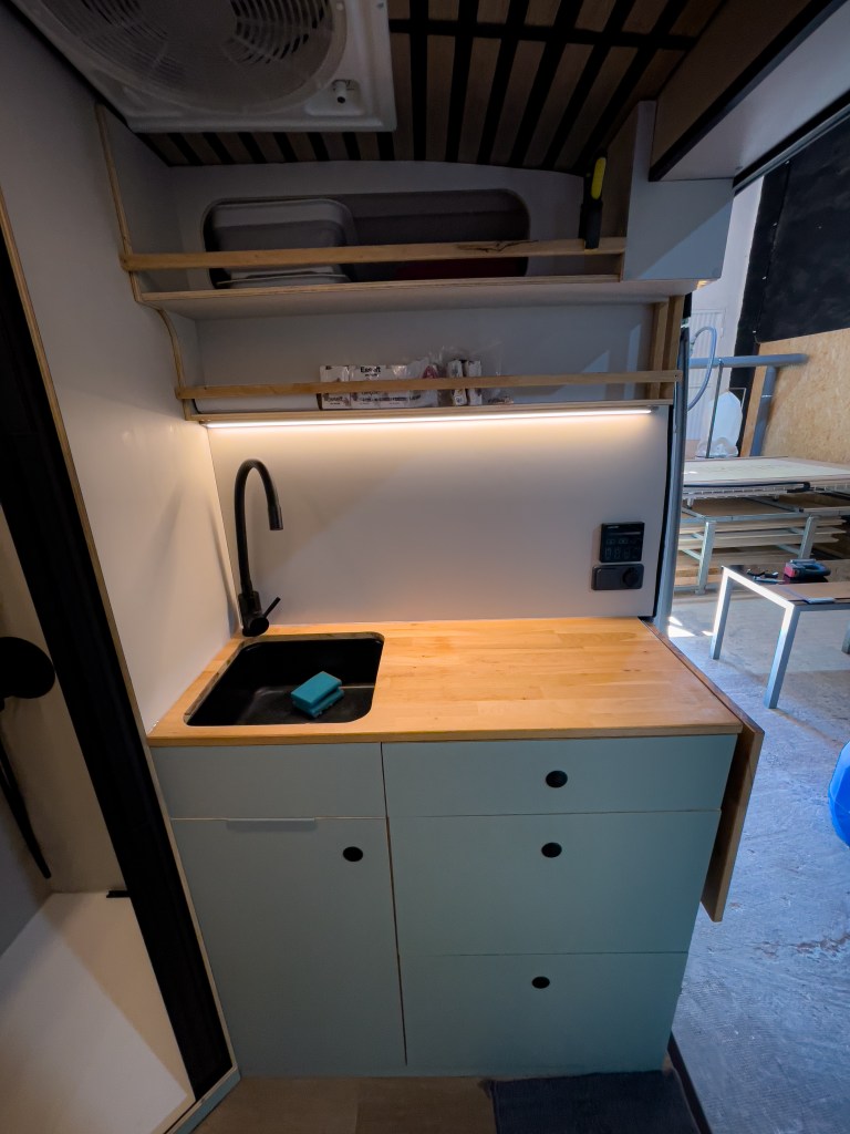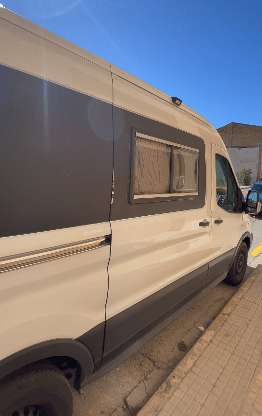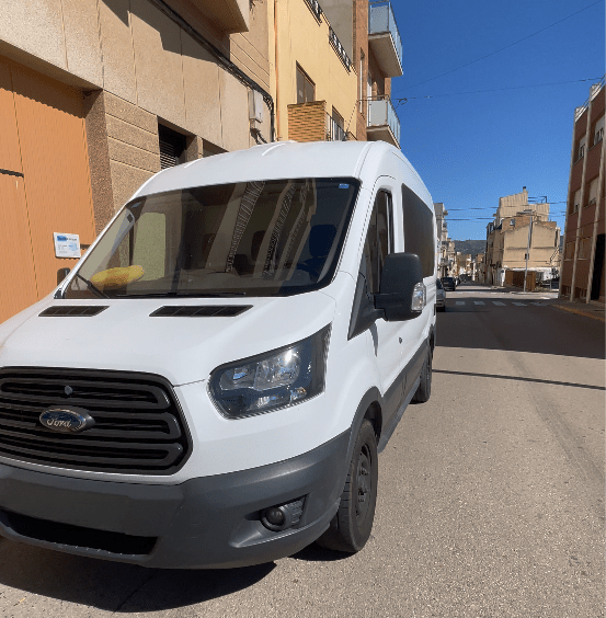Camperización de furgón Ford Transit L2 H2 de 5,40m de longitud en el que pueden viajar 3 personas.
