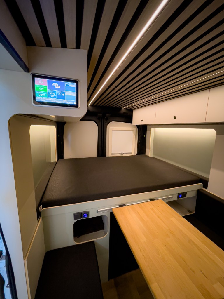 La distribución del furgón cuenta con un cómodo comedor, una gran cama para 3 personas, una zona de cocina y aseos con ducha y wc seco separador todo ello en un diseño diáfano en colores cálidos y bajo un techo alistonado en roble.